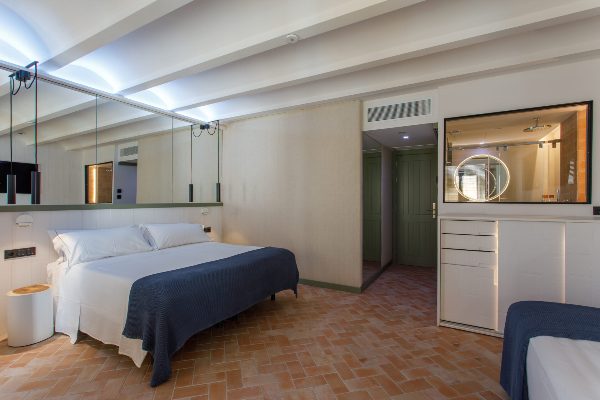 Elle dispose d’un lit double de 180×190 cm —avec option de le convertir en deux lits simples— et de deux ou trois lits simples de 90×190 cm, ainsi que d’une salle de bain intérieure avec douche.